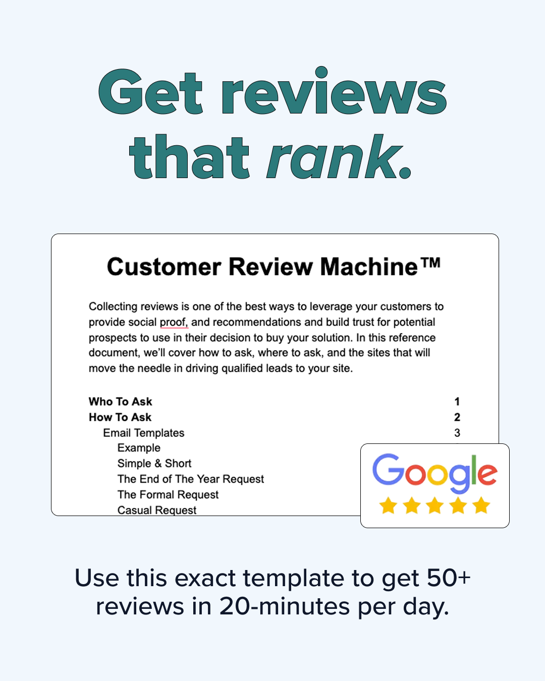 In this guide, you’ll learn how to systemize the review-collection process used by top Carrot members to earn 50+ five-star reviews in under 20 minutes a day. You’ll get proven scripts, templates, and automation ideas to ask for reviews the right way through email, text, in-person, or even your follow-up sequences. By the end, you’ll have a plug-and-play framework that helps you capture authentic stories from clients, amplify them across Google and social platforms, and turn credibility into consistent inbound leads.